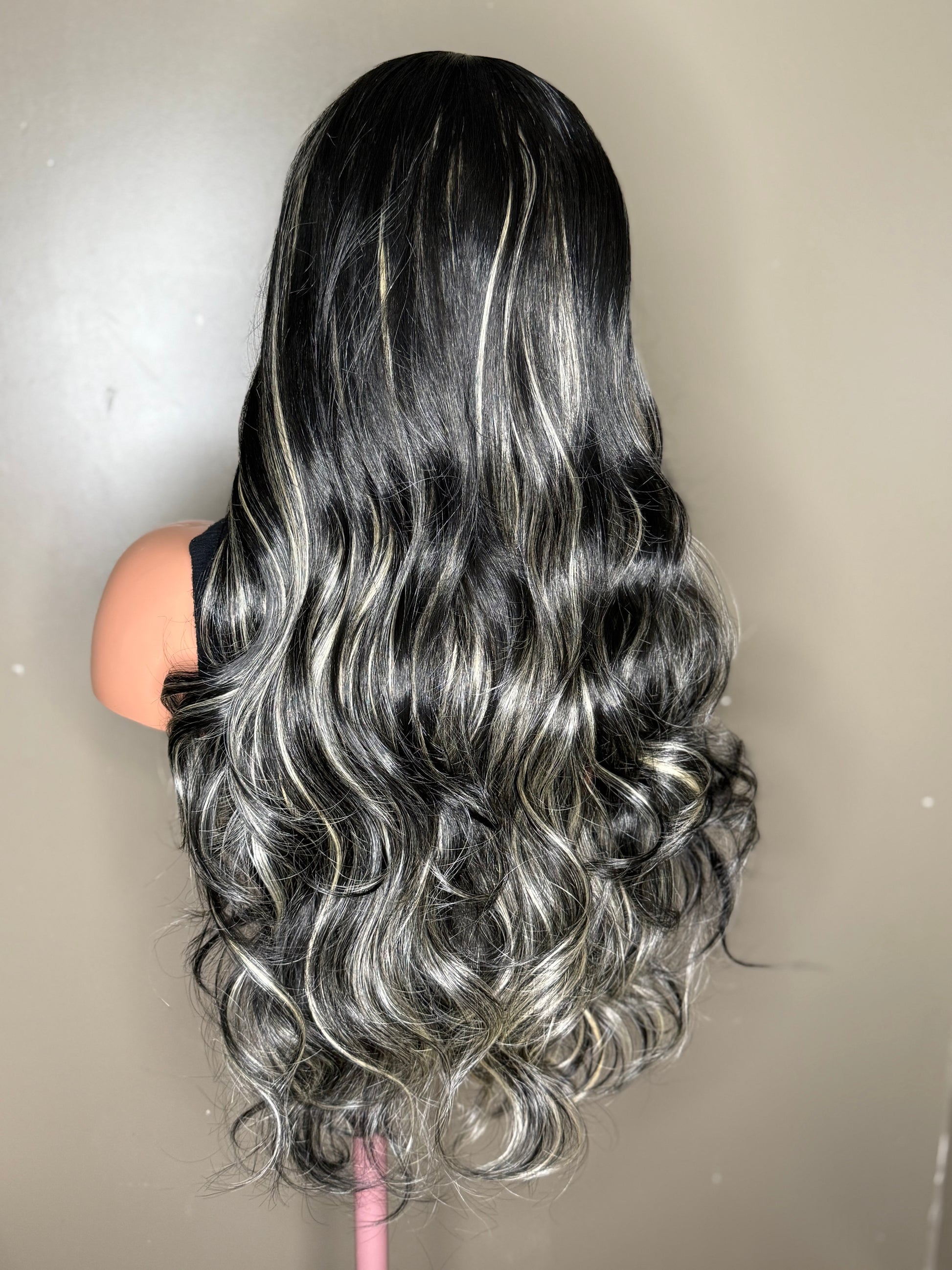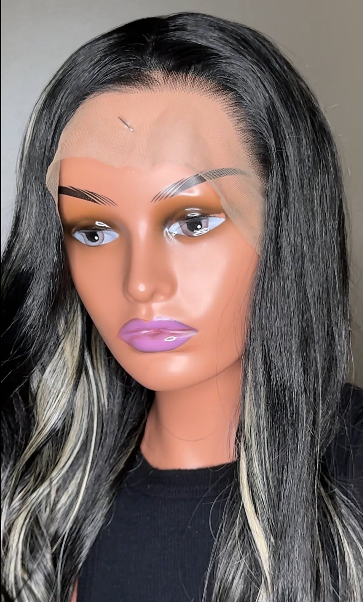This wig features a sleek black base accented with bold blonde face-framing highlights that flow into soft, loose waves for dimension and movement. The lace front ensures a seamless hairline, giving you a flawless blend that looks effortlessly natural.