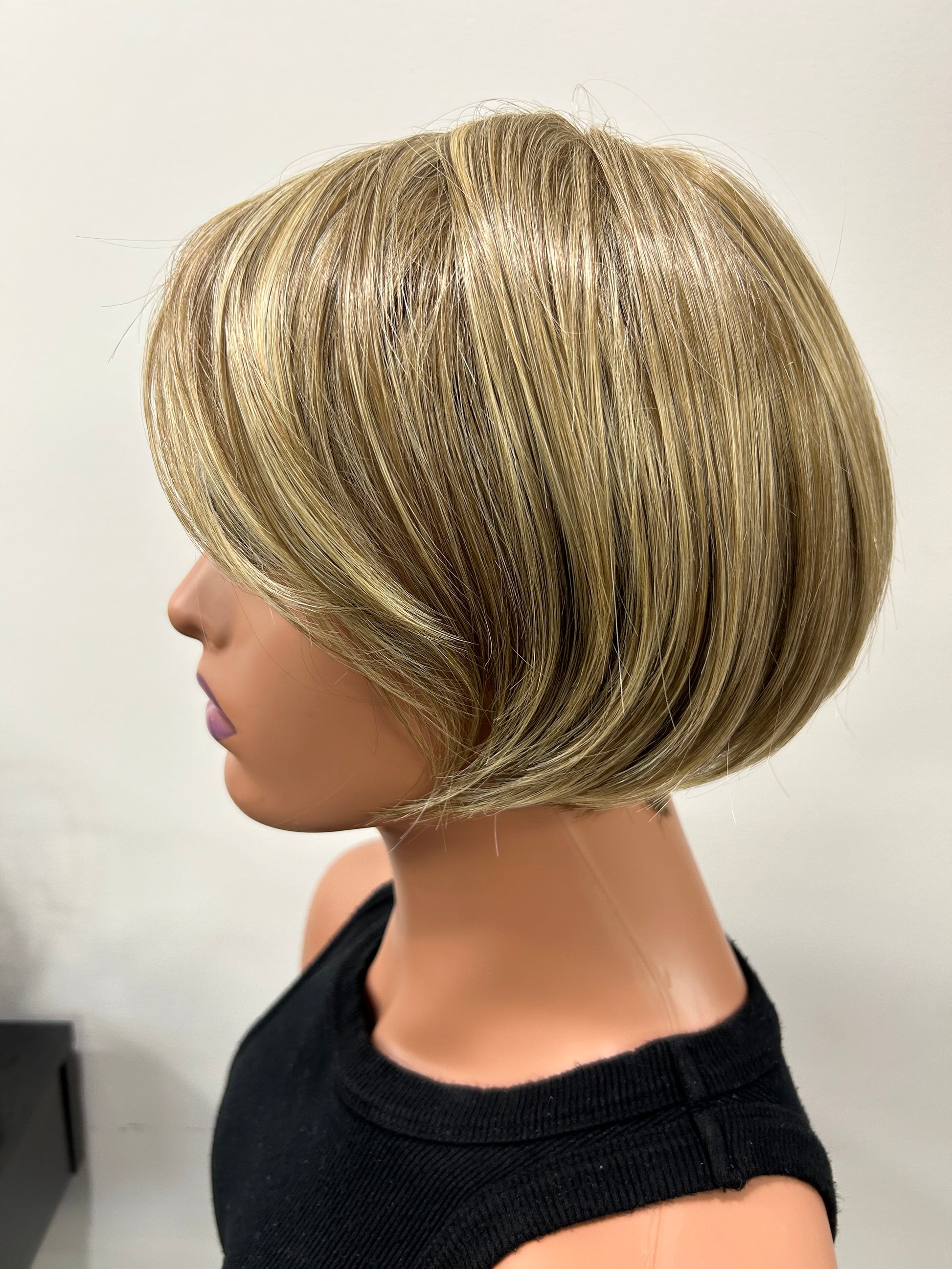 This stunning short wig features a sophisticated color blend of rich brown base tones with strategically placed blonde highlights throughout. The expertly crafted layers create natural movement and dimension, while the side-swept bangs frame the face beautifully. The monofilament top allows you to part the hair in any direction for versatile styling options.